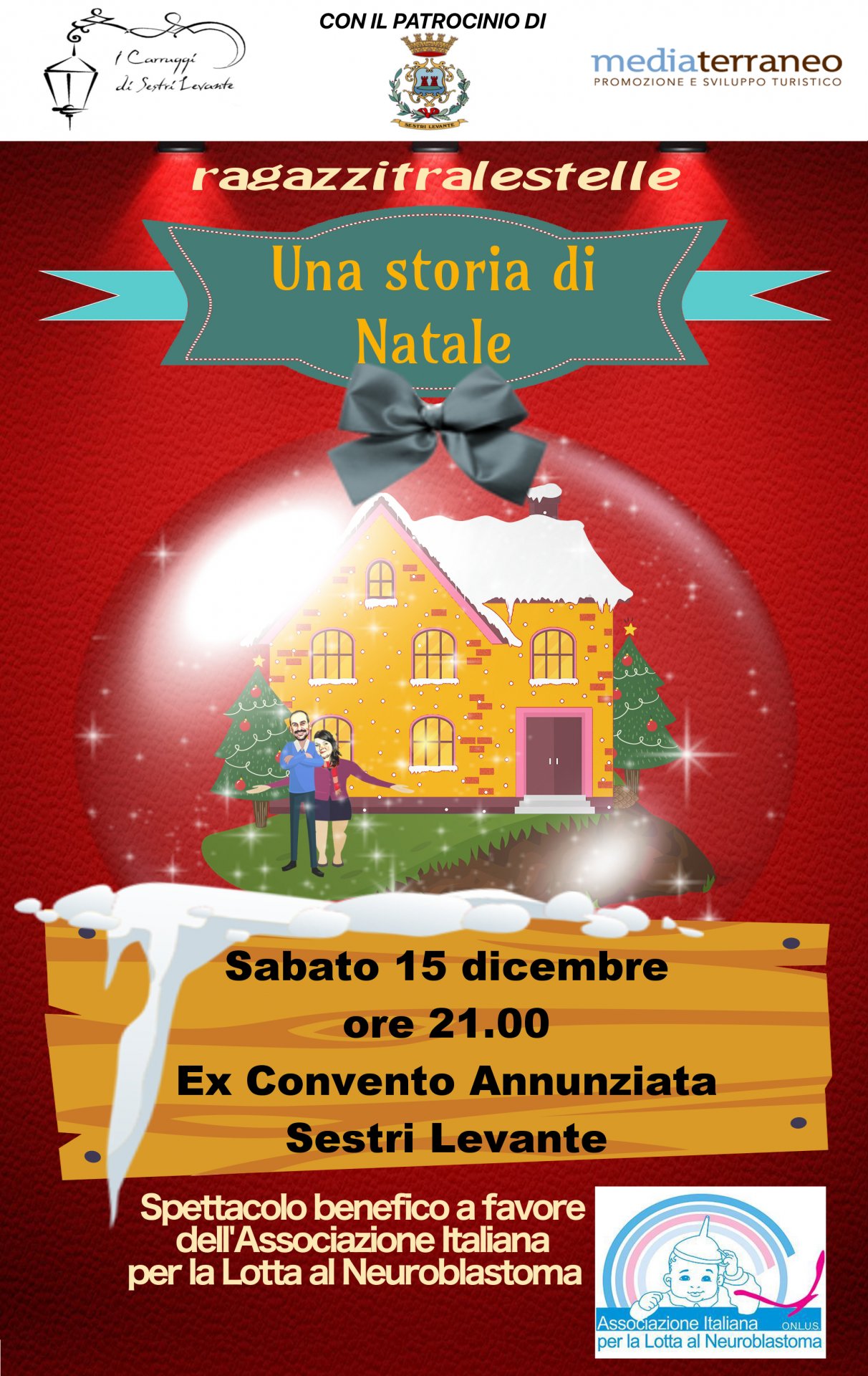 Lo spettacolo dei Ragazzitralestelle “Una storia di Natale” di sabato 15 dicembre servirà infatti per raccogliere fondi da destinare all’Associazione Italiana per la Lotta al Neuroblastoma. Alla serata saranno presenti la dott.ssa Sara Costa, presidente dell’associazione e il dott. Massimo Conte, vicepresidente e medico oncologo dell’ospedale Gaslini di Genova.