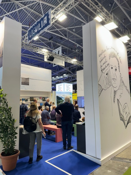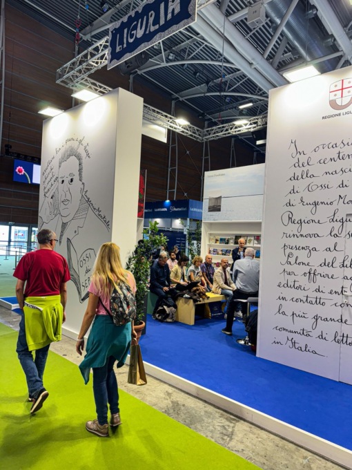 Lo spazio espositivo che ospita editori e libri liguri al Lingotto è stato pensato per celebrare i cento anni dalla pubblicazione di “Ossi di Seppia” ed è tutto dedicato al suo autore, Eugenio Montale. Il design della struttura, infatti, include una selezione di foto della mostra del Palazzo Ducale di Genova “Eugenio Montale: 100 immagini per i 100 anni di Ossi di Seppia” e i disegni, ideati in esclusiva per Regione Liguria, realizzati dall’artista Jean Blanchaert, che in occasione del primo giorno di Salone ha creato “in diretta” schizzi e disegni per i visitatori dello stand.