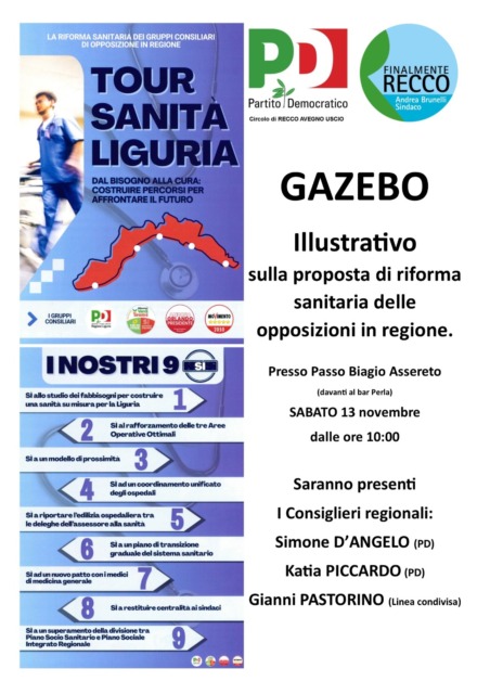 Il Circolo PD di Recco, Avegno e Uscio ed il gruppo Consiliare Finalmente Recco organizzano per sabato 13 dicembre, dalle 10, un gazebo informativo per presentare alla cittadinanza le proposte di contro riforma sanitaria dei Gruppi consiliari di opposizione in Regione Liguria.