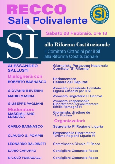 L’incontro vedrà la partecipazione di Alessandro Sallusti, giornalista e portavoce nazionale del Comitato SÌ Riforma, che dialogherà circa i capisaldi della riforma costituzionale con Giovanni Beverini, avvocato, presidente Comitato dei cittadini Liguria per il SÌ e