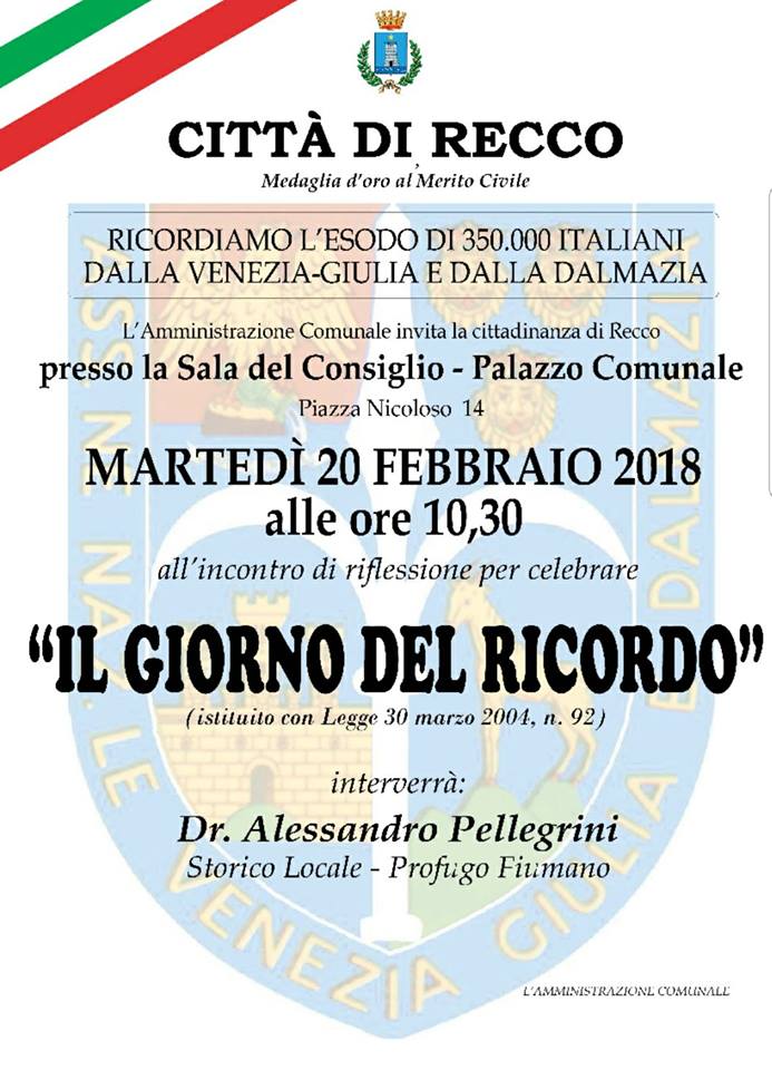 Martedì 20 febbraio nella Sala del Consiglio del Palazzo Comunale alle ore 10:30, in occasione del giorno del Ricordo, incontro sull’esodo dei 350 mila italiani dalla Venezia Giulia e dalla Dalmazia. Previsto l’intervento dello storico locale dott. Alessandro Pellegrini, profugo fiumano.