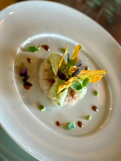 Tartare di scampi con fiori di zucca cristallizzati e cremoso alle zucchine