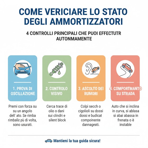 Esistono diversi metodi per capire se le sospensioni necessitano manutenzione, molti dei quali non richiedono strumenti specifici. L’infografica qui sotto mostra i quattro controlli principali che puoi effettuare autonomamente:
