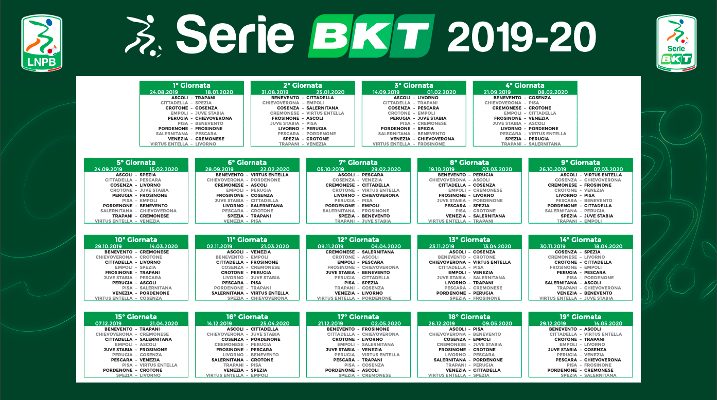 Si alza il sipario sulla nuova serie B. Ecco il calendario completo per questa nuova stagione. L’Entella debutterà in casa sabato 24 agosto contro il Livorno.