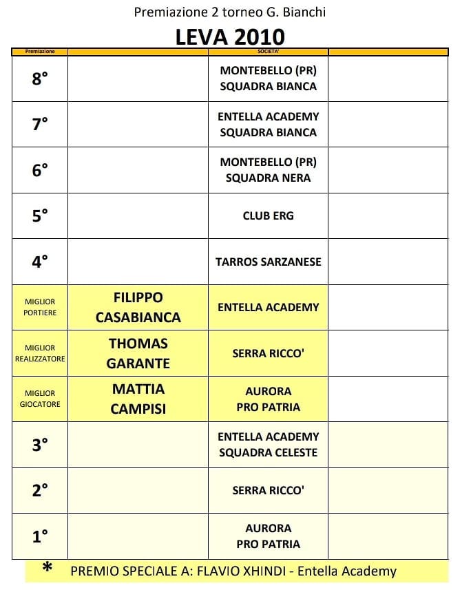 Leva 2010 Girone A: ENTELLA B.CA, SERRA RICCO’, TARROS SARZANESE, MONTEBELLO B.CA(PR), Girone B CLUB ERG, MONTEBELLO NERA, PRO PATRIA, ENTELLA CELESTE