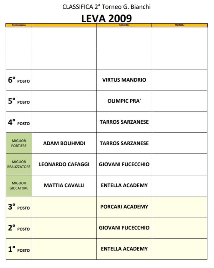 Leva 2009 Girone A : ENTELLA . TARROS SARZANESE, VIRTUS MANDRIO (RE) – Girone B OLIMPIC PRA, PORCARI ACADEMY (LU), GIOVANI FUCECCHIO (FI)