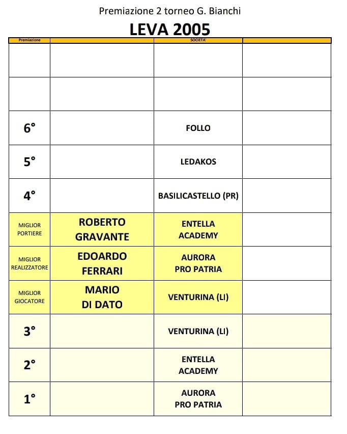 Leva 2005 Girone A : ENTELLA, LEDAKOS, VENTURINA, Girone B : FOLLO (SP), UPD BASILICASTELLO (PR), PRO PATRIA
