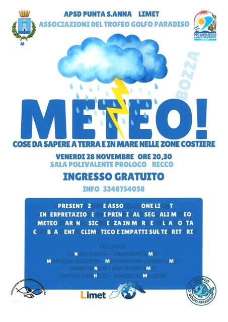 “Siamo lieti di ospitare a Recco questo incontro dedicato al meteo e alla sicurezza in mare. Sarà un’occasione utile per comprendere in modo chiaro i principali fenomeni atmosferici, le dinamiche del meteo marino e le regole di sicurezza lungo la costa, oltre a riflettere sugli effetti del cambiamento climatico sul nostro territorio” spiega il sindaco Carlo Gandolfo.