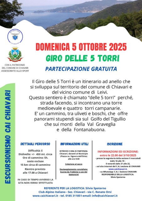 Nuovo appuntamento domenica 5 ottobre alla scoperta del territorio, con l’escursione gratuita “Giro delle 5 Torri” promossa dal Club Alpino Italiano – sezione di Chiavari con il patrocinio del Comune di Chiavari – Assessorato allo Sport.
