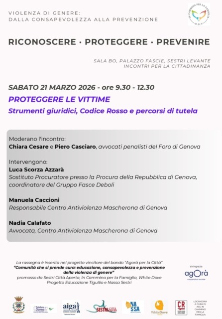 L’iniziativa fa parte del progetto “Comunità che si prende cura: educazione, consapevolezza e prevenzione della violenza di genere”, promosso dalle associazioni “Sestri Città Aperta”, “In Cammino per la Famiglia ODV”, “White Dove Progetto Educazione Tigullio” e Nassa Sestri”, vincitore del bando “Agorà per la città” della cooperativa sociale “Agorà Coop”.