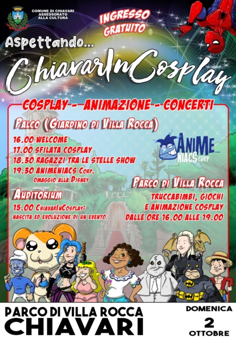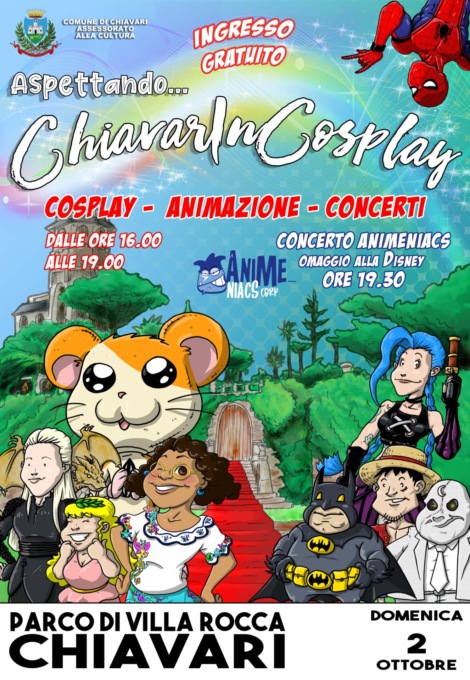 Domenica 2 ottobre cosplayers, cartoons e manga ritornano al parco di Villa Rocca per l’evento “Aspettando… ChiavarInCosplay”, organizzato dall’assessorato alla cultura del Comune di Chiavari. Una giornata a tema, una festa pop legata al colorato mondo delle anime, dei fumetti, dei cartoni animati, una preview della nuova edizione della manifestazione che si svolgerà nel 2023.