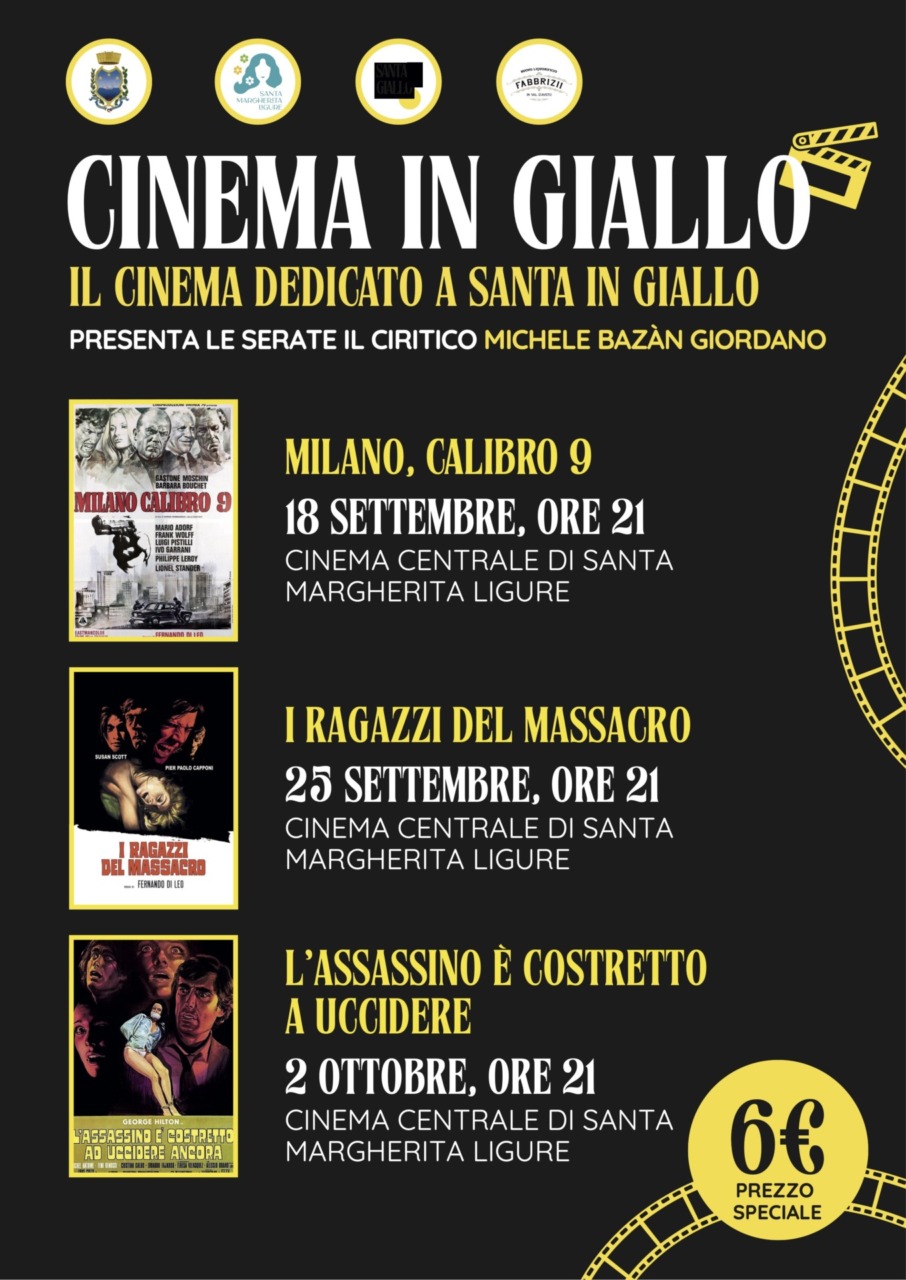 «La rassegna — afferma il direttore artistico Paolo Fizzarotti — è stata ideata e organizzata da Michele Bazan Giordano, direttore della rivista di cinema a tema Nocturno, in collaborazione con il titolare del Cinema Centrale di Santa Margherita Ligure. Per tre settimane, il giovedì alle 21, la sala sarà riservata ai film della rassegna, con il prezzo ridotto a 6 euro. La cittadinanza è invitata a partecipare: si tratta di un’occasione per riscoprire il cinema e la letteratura di genere degli anni Sessanta e Settanta, oltre che per entrare nella filosofia e nel mood di ciò che sarà Santa in Giallo».