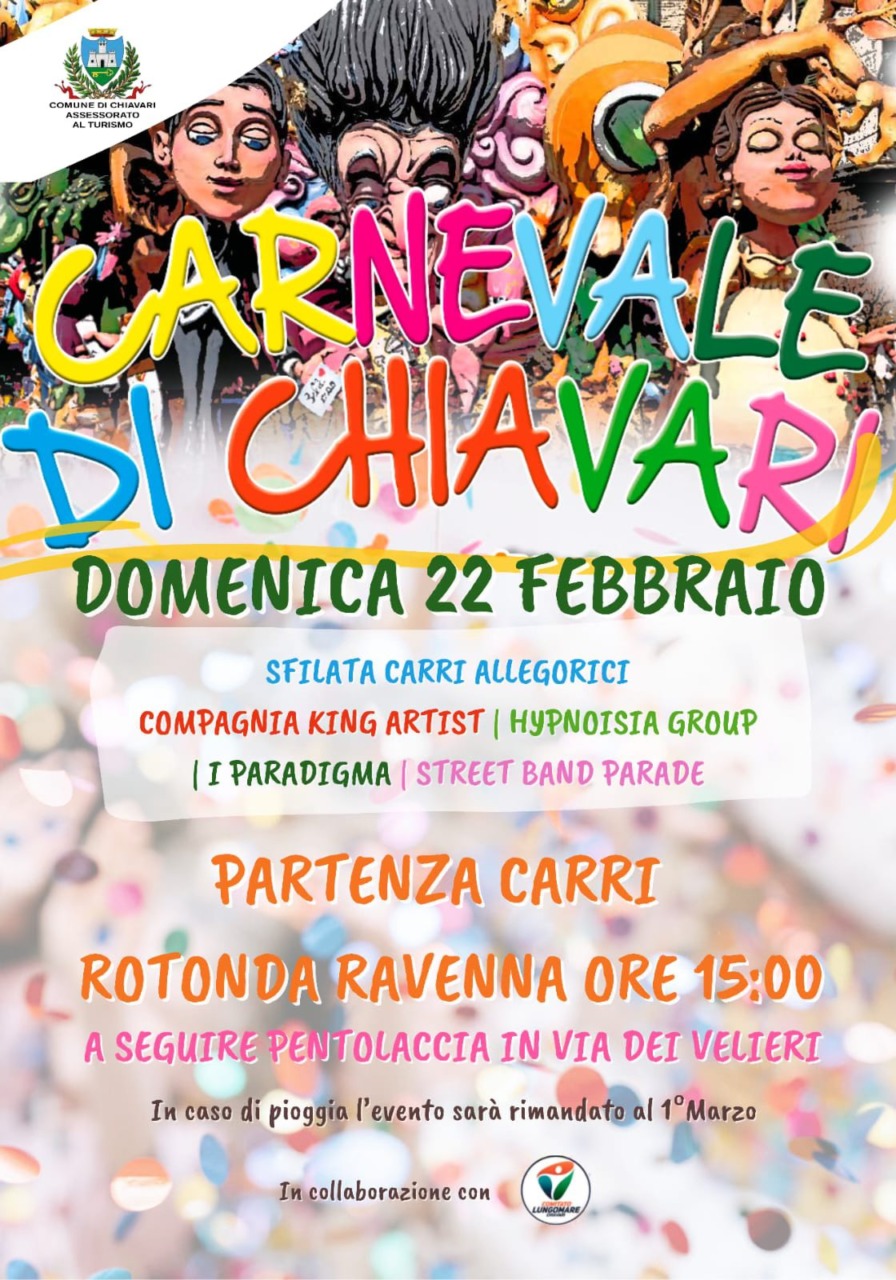 Domenica 22 febbraio il lungomare di Chiavari tornerà a riempirsi di colori e musica per l’attesa edizione del Carnevale cittadino. Il ritrovo è fissato per le ore 15:00 presso la Rotonda Ravenna, punto di partenza della sfilata dei carri allegorici che animerà l’intera zona costiera in un pomeriggio dedicato al divertimento di grandi e piccini.