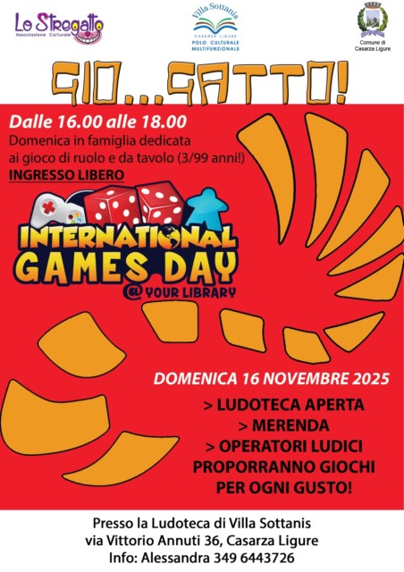 L’associazione culturale Lo Stregatto, gestore del Polo Culturale Multifunzionale Villa Sottanis, a Casarza Ligure, organizza un evento dedicato al gioco: “GIO…GATTO!” – International Games Day @ Your Library per domenica 16 novembre.