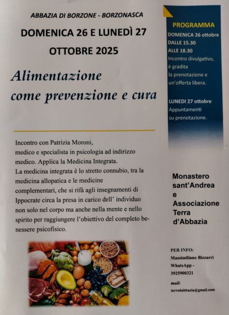 All’Abbazia di Borzone doppio appuntamento con “Alimentazione come prevenzione e cura”, incontro con Patrizia Moroni, medico e specialista in psicologia a indirizzo medico. Domenica pomeriggio dalle h 15.30 alle 18.30 incontro divulgativo, lunedì appuntamenti individuali su prenotazione.