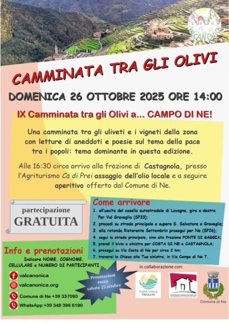 Una camminata tra gli uliveti e i vigneti della zona con letture di aneddoti e poesie sul tema della pace tra i popoli: tema dominante in questa edizione. Alle 16:30 circa arrivo alla frazione di Castagnola per un assaggio dell’olio locale in agriturismo e a seguire aperitivo offerto dal Comune di Ne. Appuntamento alle h 14.30 alla Chiesa di Campo di Ne. Partecipazione gratuita.