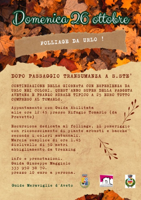 Dopo il passaggio della Transumanza a S. Stefano d’Aveto, ci si può unire alle Guide Meraviglie d’Aveto per un’escursione facile tra i colori spettacolari della faggeta avetana, quest’anno più intensa che mai. La giornata include un pranzo rurale tipico e un’esperienza immersiva tra piante, arbusti e bacche, riconoscibili secondo i toni autunnali. Appuntamento con la guida: ore 12.45 al Passo del Tomarlo.