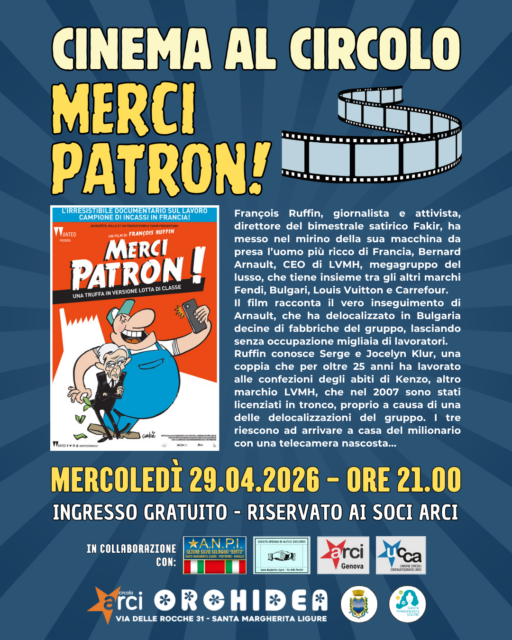 Appuntamento per mercoledì 29 aprile, alle 21, al circolo arci Orchidea di Santa Margherita Ligure, in via delle Rocche 31, per la proiezione del docufilm “Merci Patron”.
